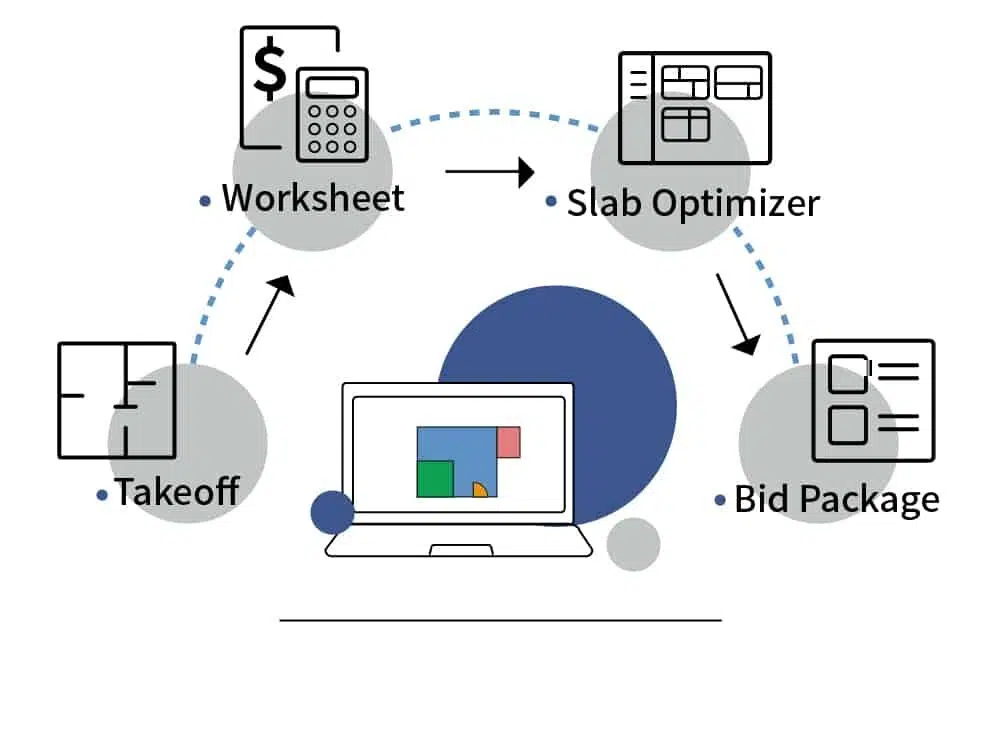 General takeoff estimating software for construction trades has existed for years, systems like AutoCAD, PlanSwift, BlueBeam have been deployed for product/area takeoffs for stone/countertop and tile projects by the trade contractors, distributors, and fabricators to streamline the estimating process.